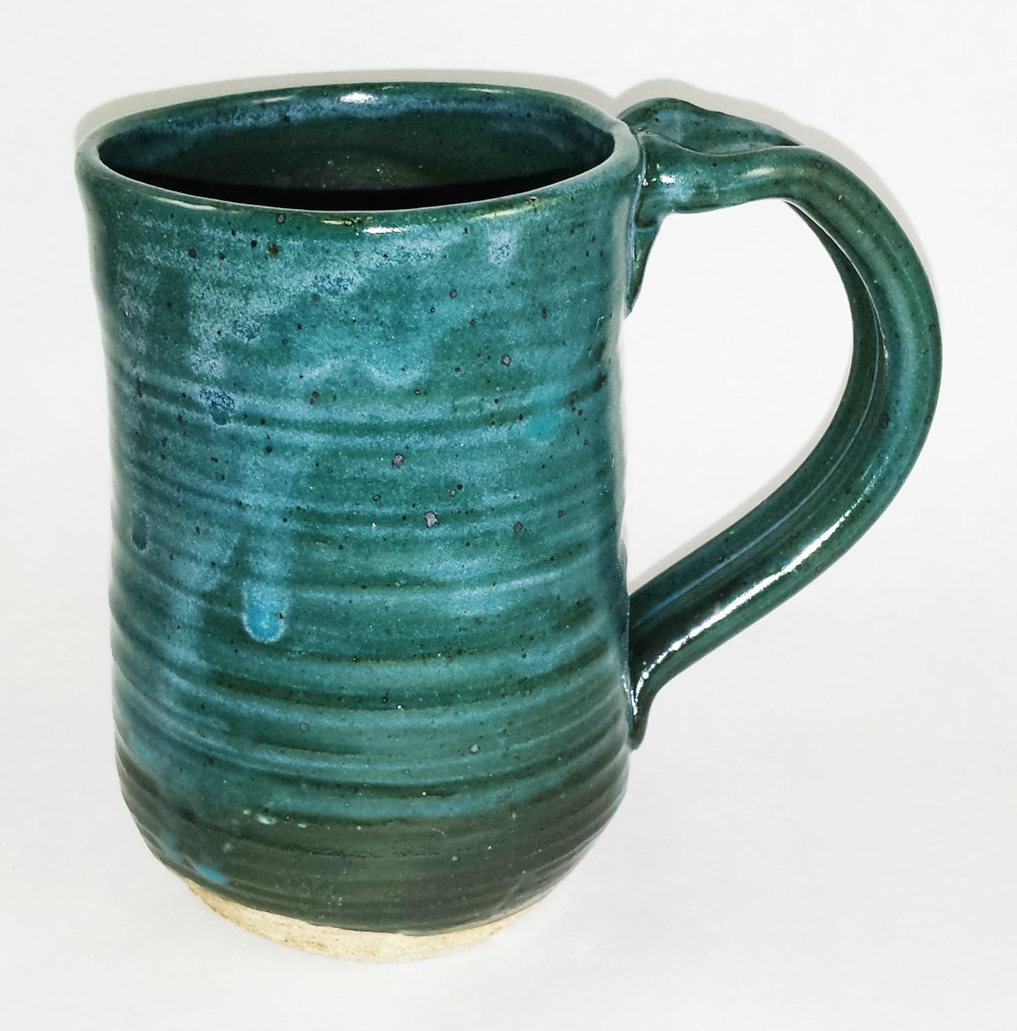 • The Aunt Chris' Pottery - Limited Edition - Hand Made Clay Drinking Mug/Cup - Blue Green Glazed - Primitive Vintage Style - Large Looped Handle - With a Natural Stone Base is a