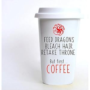 an essential choice for any warm beverage lover. The sturdy base, large handle and capacity, and thick, sturdy glass make it an excellent mug for everyday use. The classic shape is perfect for enjoying coffee, tea, or cocoa, and also makes a great gift. The versatile design lends itself not only to drinking but also to home decor. Whether you are sharing a cup of cocoa with a friend or growing your own herbs, Anchor Hocking’s CafĂ© Mug is sure to delight.the Feed Dragons, Bleach Hair, Retake Throne, But First Coffee - Travel Mug The origins of the Unemployed Philosophers Guild are shrouded in mystery. Some accounts trace the Guild's birth to Athens in the latter half of the 4th century BCE. Allegedly, several lesser philosophers grew weary of the endless Socratic dialogue endemic in their trade and turned to crafting household implements and playthings. (Hence the assertions that Socrates quaffed his hemlock poison from a Guild-designed chalice, though vigorous debate surrounds the question of whether it was a "disappearing" chalice.)Others argue that the UPG dates from the High Middle Ages, when the Philosophers Guild entered the world of commerce by selling bawdy pamphlets to pilgrims facing long lines for the restroom. Business boomed until 1211 when Pope Innocent III condemned the publications. Not surprisingly, this led to increased sales, even as half our membership was burned at the stake.Feed Dragons, Bleach Hair, Retake Throne, But First Coffee - Travel Mug is best for you'Feed Dragons, Bleach Hair, Retake Throne, But First Coffee'. This is THE perfect gift for that Khaleesi lover in your life :). ------------------------- .: DETAILS :. * One Travel Mug * Design - Front ONLY * Porcelain Mug | Silicone Top * Dishwasher Safe * Designed and Created in New York, USA * 10 OZ For a chance for your photo to be featured on our website, please post your photos with #PaintedPrettyDesigns on Instagram or Facebook! ----- Facebook :: www.facebook.com/PaintedPrettyDesigns Instagram :: @PaintedPrettyDesigns Twitter :: @PaintedPrettyD COPYRIGHT © 2014 Lauren Salese, Owner, Painted Pretty Designs, LLC All rights reserved. No part of this publication may be reproduced or transmitted in any form or by any means.