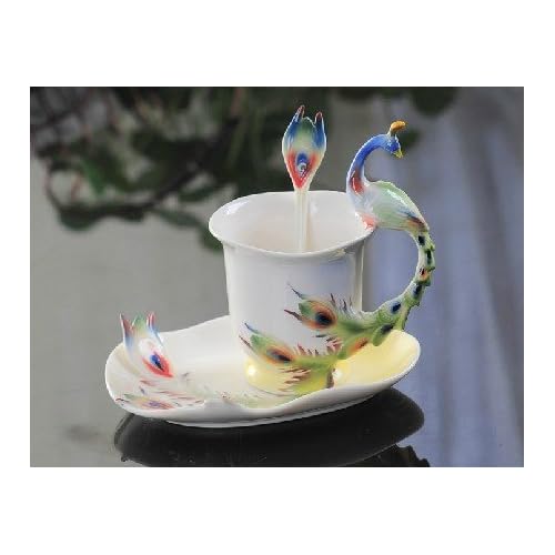 • The Glodeals (TM) Hand Crafted Porcelain Enamel Delicate Peacock Tea Coffee Cup Set with Saucer and Spoon (Bright Color) is a