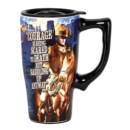 John Wayne Courage Ceramic Travel Mug Coffee Gift Spoontiques is best for you'Courage is being scared to death but saddling up anyway.' Honor The Duke by taking home this 20-ounce John Wayne Courage Mug today! John Wayne was an Academy Award and Golden Globe Award-winning actor. He epitomized rugged masculinity and has become an enduring American icon. He's famous for his distinctive voice, walk, and height. In 1999, the American Film Institute named Wayne 13th among the Greatest Male Stars of All Time.