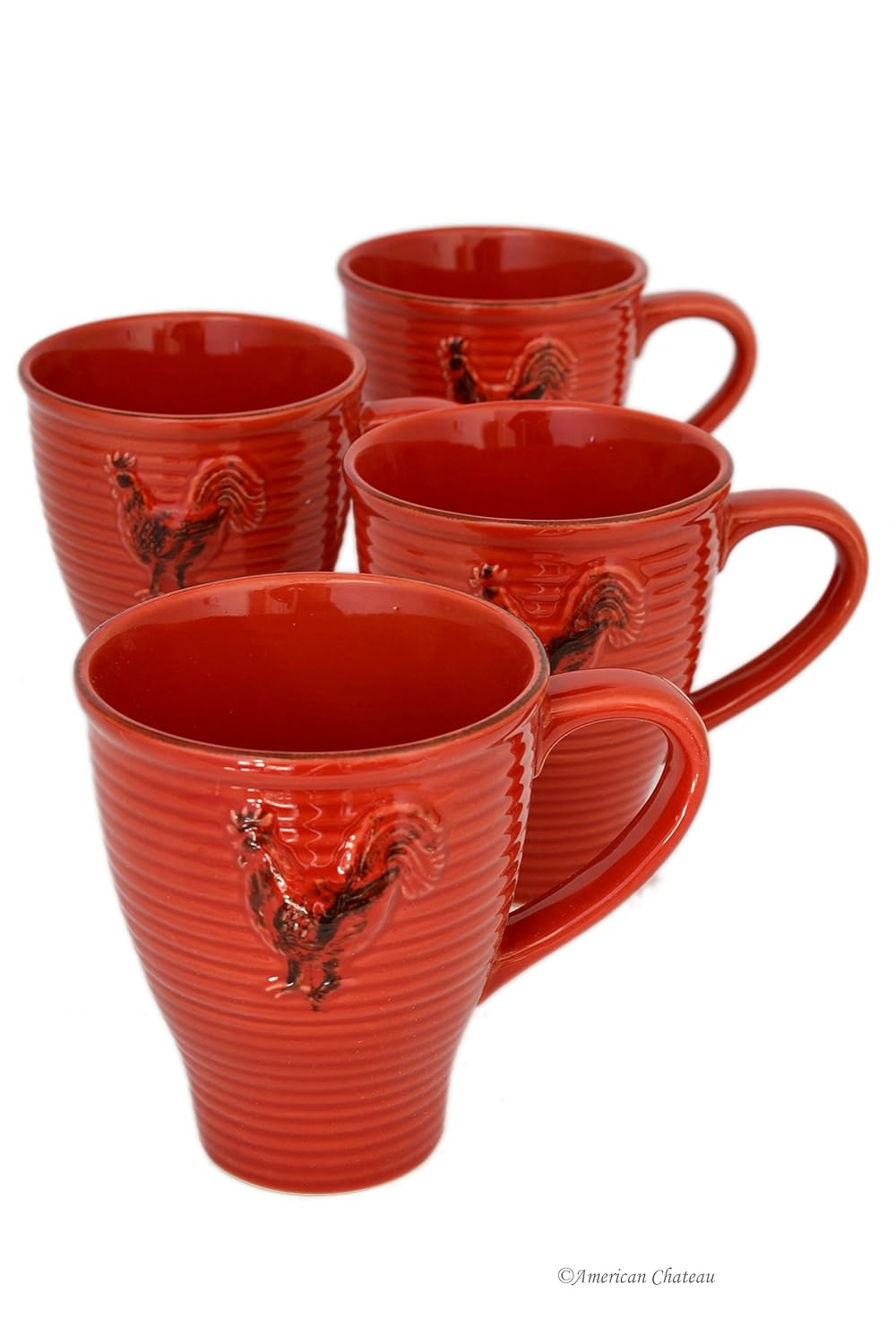 Set 4 Stoneware Ribbed Vintage Red Tea Coffee Mugs with Rooster Emblem is best for youSet 4 Coffee / Tea Mugs with Rooster Emblem; High quality Ceramic with a Ribbed Design; 12 oz Capacity ; Vintage Look ; Approximate Size: 5' x 4 1/2' x 3 3/4'