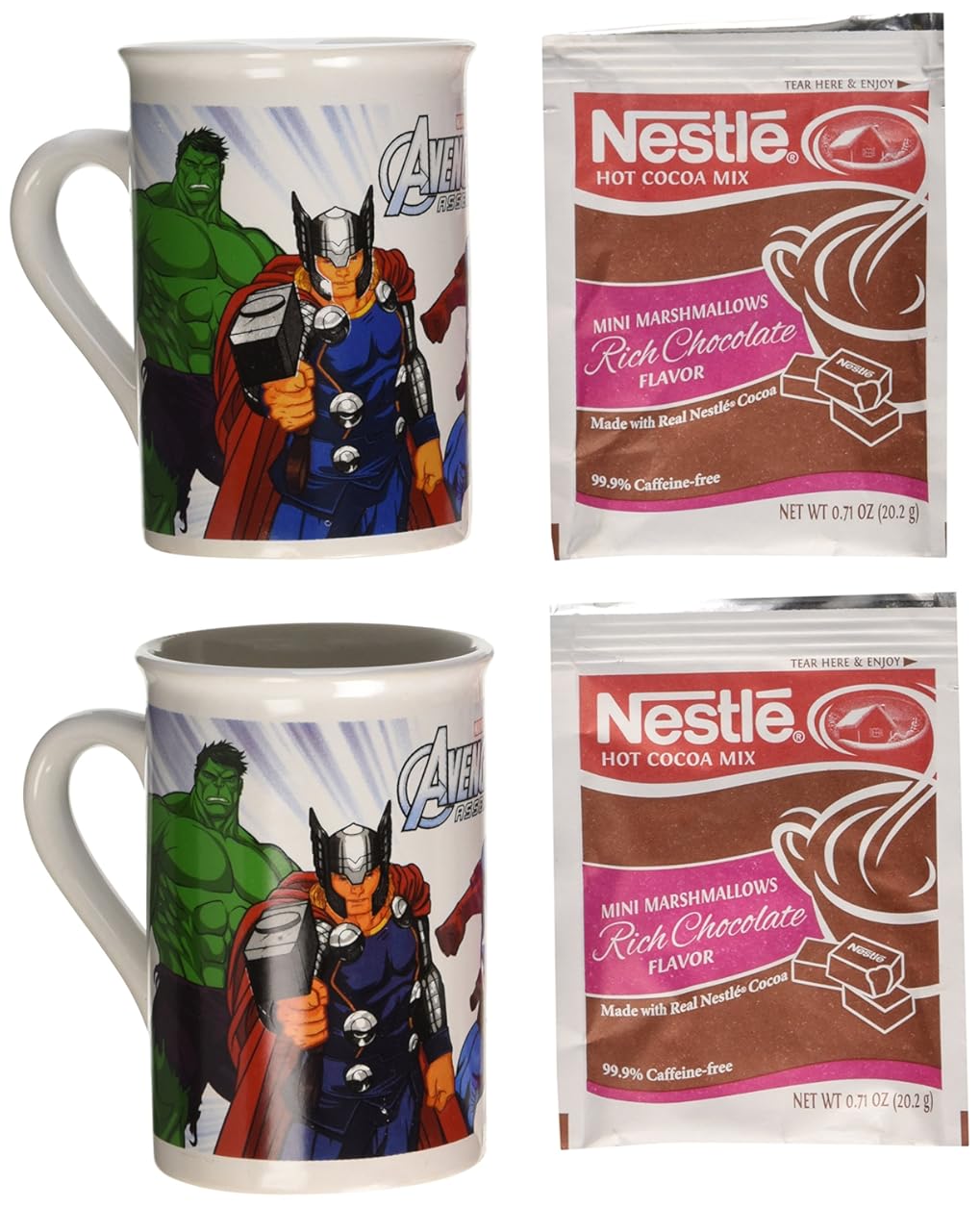 Avengers Hot Cocoa Mug Set (Contains 2 Cups) is best for youYou will be getting 2 mugs with detailed graphic designs of the Marvel Avengers. It also includes 2 packets of Nestle Cocoa mix with miniature marshmallows. Great for those cold nights sitting by the fire.