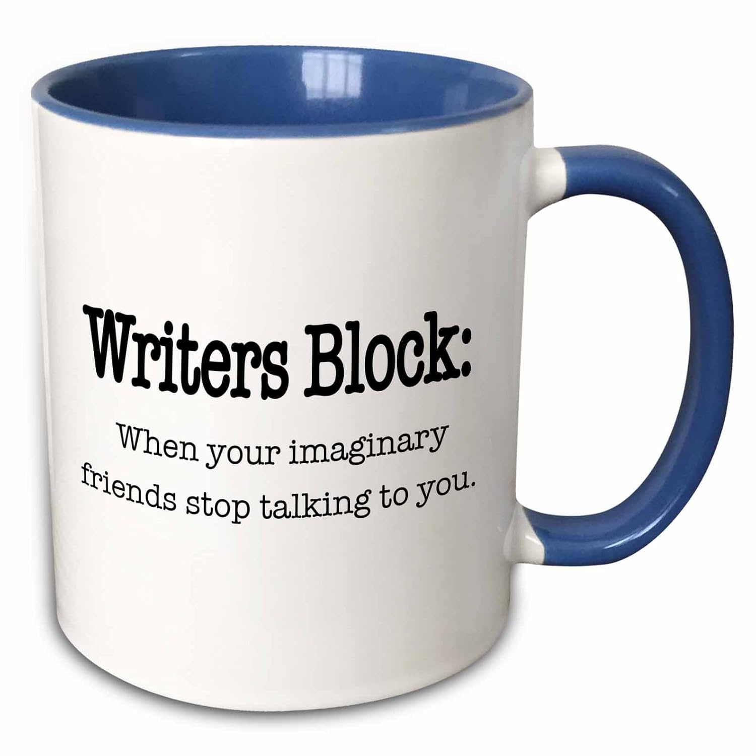 EvaDane - Funny Quotes - Writers block when your imaginary friends stop talking to you - 11oz Two-Tone Blue Mug (mug_157392_6) is best for youSize:11-oz Two-Tone Blue Mug Writers block when your imaginary friends stop talking to you Mug is available in both 11 oz and 15 oz. Why drink out of an ordinary mug when a custom printed mug is so much cooler? This ceramic mug is lead free, microwave safe and FDA approved. Image is printed on both sides. Hand washing is recommended.