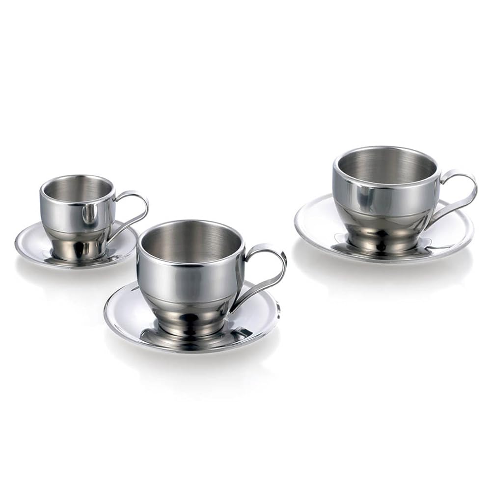 UName Insulated Stainless Steel Double Walled Coffee Cup with Saucer, 160 ml,5.2oz,UN053 is best for youAlways feel tired? You need a cup of wake up coffee Made of stainless steel with double walls, it features an insulated construction that it keeps your drink on hand for long and doesn't burn your hands. The lining is matt finish while the surface is mirror finish, and it feels very comfortable with smooth curved line. Understated appearance fits any home decor. You are sure to be satisfied with our stainless coffee cup series. Every morning all that you need is a cup of coffee, a brand new day begins with you nice mood. *Hand wash or with soft wet cloth to avoid scratches Dimensions:5.4 floz capacity