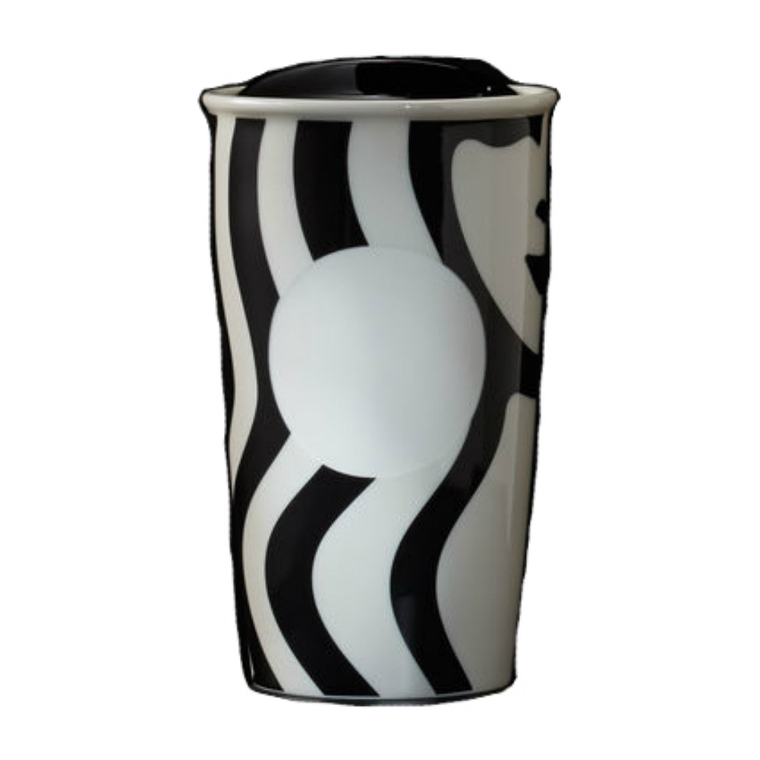 Starbucks 2015 Super Graphic Siren Traveler Ceramic Coffee Mug, 12 Oz is best for youThis collectible mug zooms in on the iconic logo Siren, depicted in bold black strokes on white. The laser-etched center dot enhances the coffee mug's modern look. The ceramic mug's double wall construction helps keep coffee hot while hands stay cool, and its travel-friendly ceramic press-in lid with silicone seal minimizes spills. Holds 12 fl oz. Hand wash only. Do not microwave. Part of the 2015 Dot Collection, the mug comes ready to gift in a bright red box, and additionally sealed in plastic for protection.