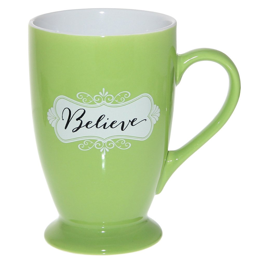 a copper plated exterior 20 ounce Solid brass easy grip handle that easily wipes clean with warm damp cloth and hand dry clean Not for use in microwave or dishwasher Enjoy your cocktail freezing cold in these shiny copper mugs Solid handcrafted superior quality copper with high quality stainless steel lining and easy-grip brass handle Hygienic, easy to clean. Hand wash recommended Great for chilled beer, iced coffee, iced tea and any vodka, gin, rum, tequila, whiskey mixed drinks or for any beverages desired for a better cold drinking experience Capacity: 20 fl. Ounces. Set includes 1 mug. Dimensions: 3.2 Inch diameter by 4 Inch highthe Chartreuse "Believe" Café Mug essential for the chemical ionization of acids found in citrus fruits such as limes, lemons, and oranges - key ingredients in your favorite summer cocktails including Moscow Mules. For this reason, other mugs that have stainless steel linings or are coated with food lacquer or nickel do NOT have the same taste as drinking from a pure copper mug. Treat yourself when you mix up a cocktail and make sure you’re sipping from 100% copper Chartreuse "Believe" Café Mug is best for youOne of a trio of pretty glossy pastel Inspirational Café Mugs. You are going to like the contours of this soft Chartreuse Ceramic Mug decorated with a filigree frame and the expression, 'Believe'. The back is decorated with Scripture from Mark 10:27, 'All things are possible with God'. The inside is glazed in white.